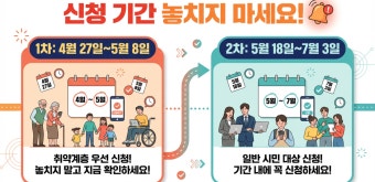 | 1차 | 2026.4.27(월) ~ 5.8(금) 18:00 | 기초수급자·차상위계층·한부모가족 |